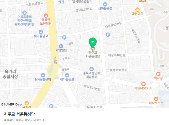 승용차 : 청주IC – 15Km – 서운동 순교 성지 성당(21분)